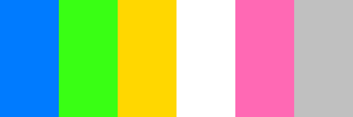 Electric Blue: #007 Bff Neon Green: #39 Ff14 Bright Yellow: #Ffd700 White: #Ffffff Hot Pink: #Ff69 B4