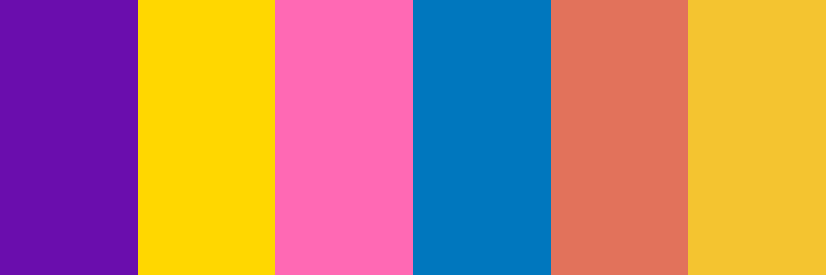 1. Majestic Purple: #6 A0 Dad 2. Royal Gold: #Ffd700 3. Vibrant Pink: #Ff69 B4 4. Ocean Blue: #0077 Be 5. Terracotta Orange: #E2725 B 6. Saffron Yellow: #F4 C430 7. Cerulean Blue: #007 Ba7 8. Fuchsia Pink: #Ff00 Ff