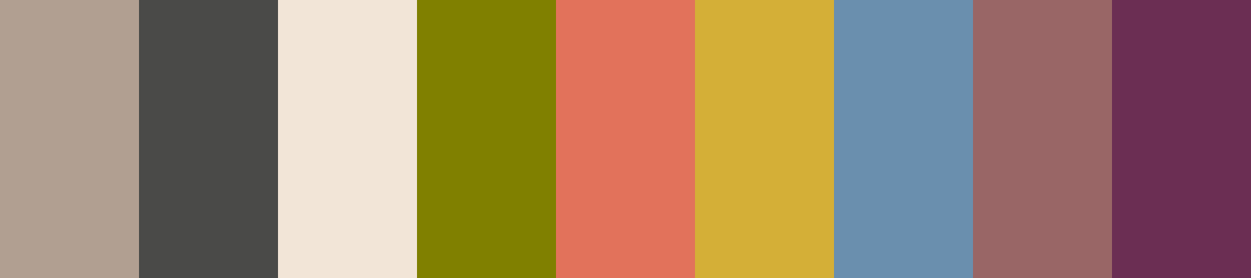 Neutrals: Soft Taupe: #B19f91 Charcoal Gray: #4a4a48 Ivory: #F2e5d7 Warm Tones: Olive Green: #808000 Terracotta: #E2725b Mustard Yellow: #D4af37 Cool Tones: Soft Blue: #6a8fae Mauve: #996666 Plum: #6b2e53
