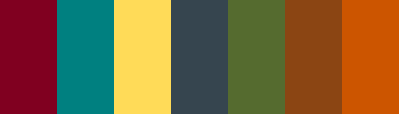 1. *Deep Burgundy*: #800020 2. *Teal*: #008080 3. *Mustard Yellow*: #Ffdb58 4. *Charcoal Gray*: #36454 F 5. *Olive Green*: #556 B2 F 6. *Warm Brown (Chestnut)*: #8 B4513 7. *Burnt Orange*: #Cc5500