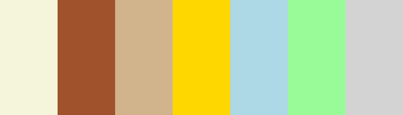 This color palette embodies a warm and inviting atmosphere, perfect for creating a cozy environment. The soft beige and light brown evoke feelings of comfort and earthiness, while the warm wooden tone adds a touch of natural elegance. Sunlight golden yellow brings brightness and cheer, reminiscent of sunny days. The light blue and soft green introduce a playful yet soothing element, ideal for children's clothing. Finally, the soft gray balances the palette, providing a neutral backdrop that enhances the warmth of the other colors.