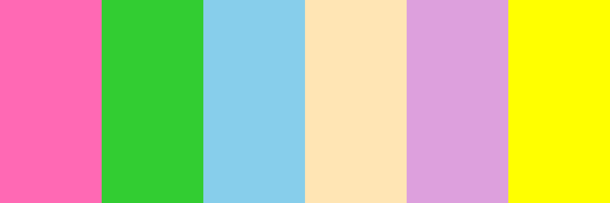 3. Candy Pop Primary Color: Bubblegum Pink (#Ff69 B4) Secondary Color: Lime Green (#32 Cd32) Accent Color: Sky Blue (#87 Ceeb) Background Color: Pale Peach (#Ffe5 B4)