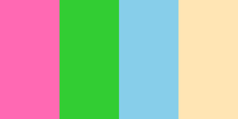 ```color_palette Here's a vibrant color palette inspired by your query: ### Candy Pop Color Palette 1. **Bubblegum Pink** - **Hex Code**: #FF69B4 - **Description**: A lively and playful pink that captures the essence of sweetness and fun. 2. **Lime Green** - **Hex Code**: #32CD32 - **Description**: A refreshing and zesty green that adds a burst of energy and vibrancy to the palette. 3. **Sky Blue** - **Hex Code**: #87CEEB - **Description**: A soft and calming blue reminiscent of clear skies, providing a serene contrast to the brighter colors. 4. **Pale Peach** - **Hex Code**: #FFE5B4 - **Description**: A warm and inviting peach that serves as a gentle background, enhancing the overall brightness of the palette. 5. **Sunny Yellow** - **Hex Code**: #FFD700 - **Description**: A cheerful and sunny yellow that adds an extra touch of brightness and joy, harmonizing beautifully with the other colors. ### Palette Overview This Candy Pop color palette is designed for those who love bold and cheerful aesthetics. The combination of Bubblegum Pink, Lime Green, and Sky Blue creates a playful vibe, while the Pale Peach background offers a warm, soft touch. The addition of Sunny Yellow further enhances the brightness, making this palette perfect for designs that aim to evoke happiness and playfulness. ```