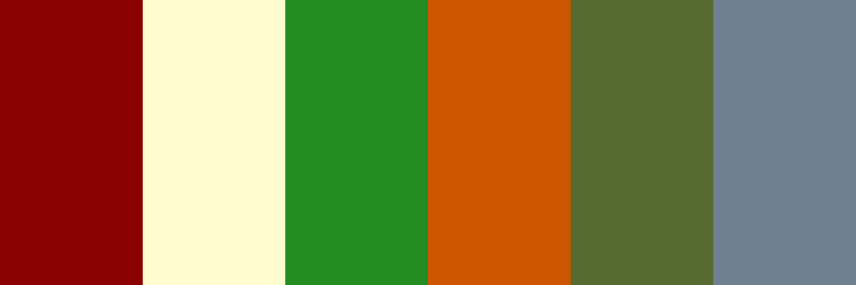 Rust Red (#8 B0000),Cream (#Fffdd0), Forest Green (#228 B22)