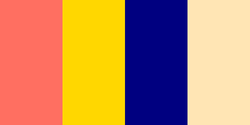 Coral ( #FF6F61 ) Mustard Yellow ( #FFD700 ) Navy Blue ( #000080 ) Soft Peach ( #FFE5B4 )