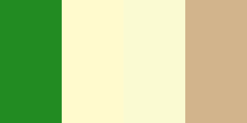 Forest Green: #228 B22 Pale Yellow: #Fffacd Soft Cream: #Fafad2 Clay Brown: #D2 B48 C