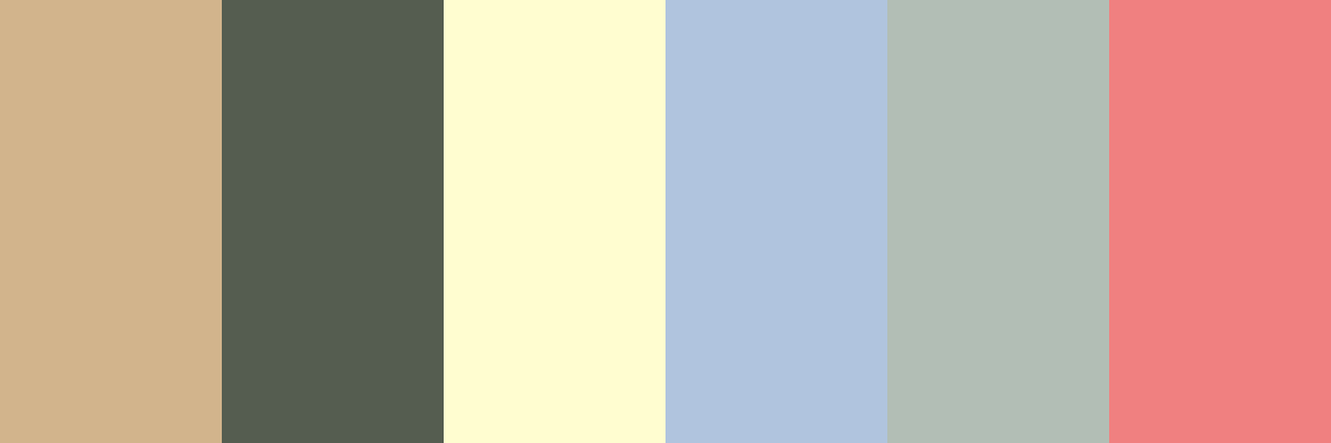 This palette combines earthy neutrals and soft pastels to create a serene atmosphere. The warm tan and cream provide a cozy foundation, while ebony adds depth and sophistication. Misty blue and sage green introduce calming elements, and soft coral brings a subtle pop of color, making this palette versatile for various design applications.