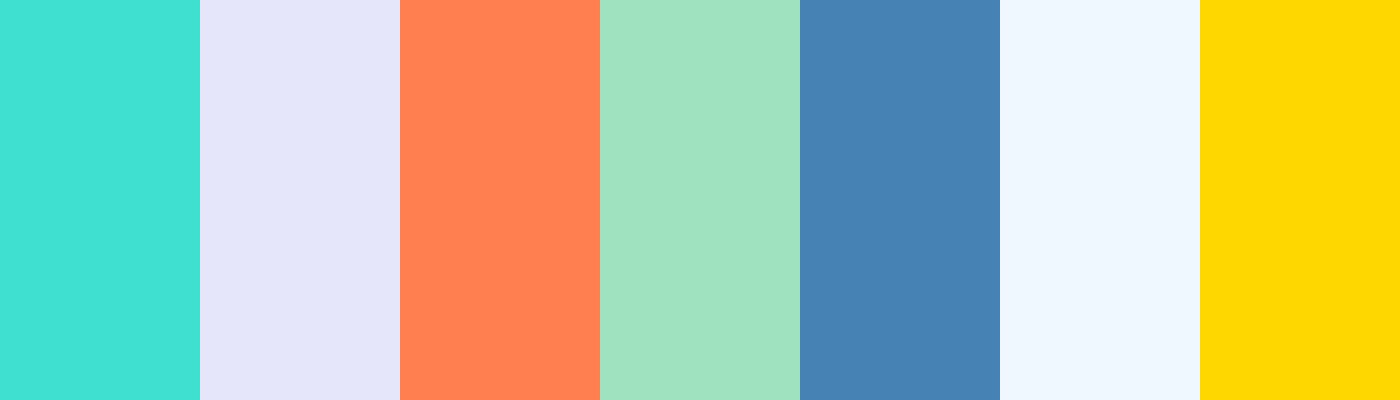 Turquoise Blue (#40 E0 D0) Lavender (#E6 E6 Fa) Coral Pink (#Ff7 F50) Seafoam Green (#9 Fe2 Bf) Deep Ocean Blue (#4682 B4) Pearlescent White (#F0 F8 Ff) Metallic Gold (#Ffd700)