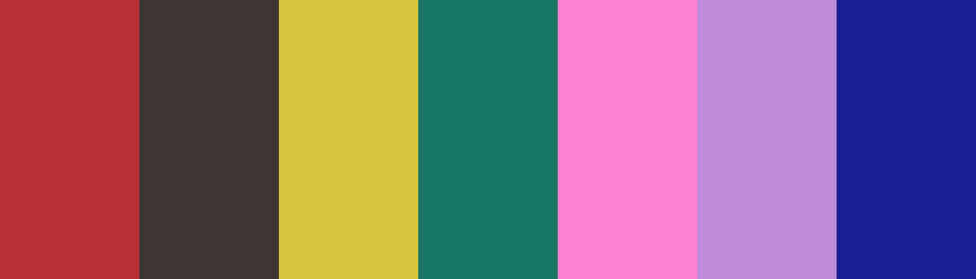 #B53136 , #3D3634 , #D8C33A , #177765 , #FD81D1 , #BD8CDB , #1A1F96