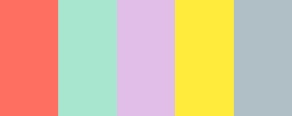 This color palette features a bright coral as the standout color, complemented by softer shades of mint, lavender, and warm yellow for balance, while the cool gray adds a touch of neutrality and sophistication.