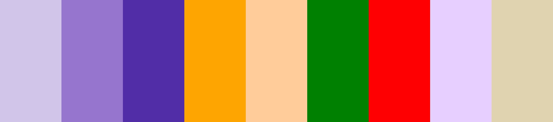 Light Purple (#D1c4e9) Medium Purple (#9575cd) Dark Purple (#512da8) Light Beige (#E0d3af) Orange (#Ffa500) Peach (#Ffcc99) Green (#008000) Red (#Ff0000)