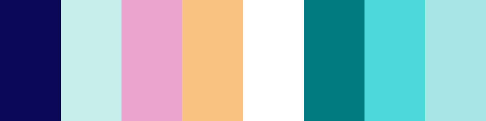 To complement your existing color palette of Deep Navy Blue ( #0b0757 ), Soft Mint Green ( #c4edeb ), Pastel Pink ( #e8a4c9 ), Warm Apricot ( #f9c282 ), Pure White ( #ffffff ), and the suggested gold shades, you’ll want a shade of teal that enhances the overall aesthetic while still providing a refreshing touch. Here are a couple of teal shades that would work beautifully: