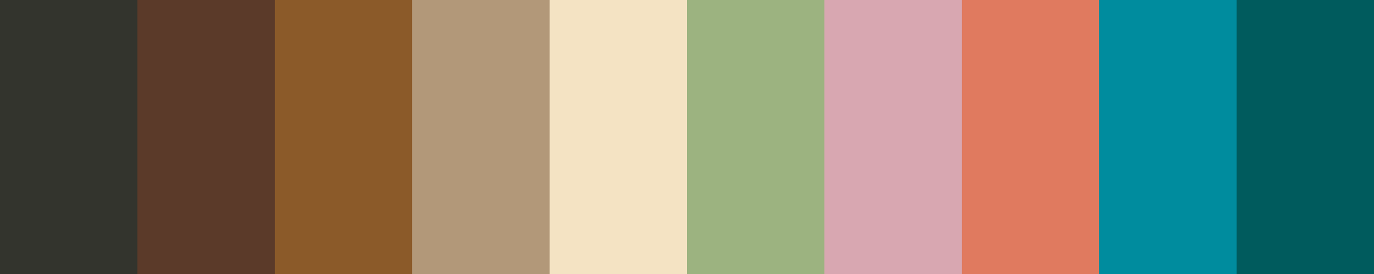 - A medium, warm brown that enhances the earthy feel of the palette, balancing the vibrant colors.