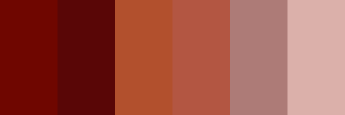 from these colors below, create a harmonious warm palette using 6 colors < Harmonious Autumn Wedding Palette - Reordered with Dark Red Next to Burgundy> 1. Sage Green - #9BA59C - A soft, muted sage green that complements the eucalyptus, adding a tranquil and natural touch to the palette. 2. Eucalyptus - #697B6E - A deeper, muted green that reflects the natural tones of eucalyptus leaves while providing a calming and sophisticated touch. 3. Dark Green - #0A3428 - A rich, deep green that adds sophistication and depth to the palette while evoking the beauty of nature. 4. Dusty Rose - #AD7B77 - A soft, warm dusty rose that introduces a hint of romance and balances the richness of the other colors. 5. CinnaPink - #DBB0AA - A gentle blush tone that adds a light, romantic touch and balances the richer hues of the palette. 6. Terracotta - #8E443D - A warm, earthy terracotta with rich, muted tones that adds depth and complements the rustic feel of the palette. 7. Burnt Terracotta - #B35642 - A warm, rich burnt terracotta that enhances the earthy tones and complements the overall warmth of the palette. 8. Burnt Sienna - #B2502D - A warm, rich burnt sienna that adds a touch of earthiness and enhances the autumnal vibe, beautifully complementing the other colors. 9. Picante - #A94B35 - A vibrant, spicy red-orange that adds a lively, warm touch next to the burnt sienna. 10. Paprika Kisses - #D2664C - A warm coral red that adds a soft, inviting touch, enriching the palette with its warmth and versatility. 11. Burgundy - #590606 - A deep, dark red that enhances elegance and warmth, providing a bold statement perfect for an autumn wedding. 12. Dark Red - #6F0600 - A very deep, rich red that adds intensity and depth, enhancing the overall warmth and boldness of the palette. 13. Deep Crimson - #640D16 - A dark, rich crimson that adds depth and a dramatic flair, enhancing the elegance and warmth of the palette. 14. Vibrant Red - #9F2800 - A striking vibrant red that adds a bold and lively element to the palette, enhancing the autumnal color scheme.
