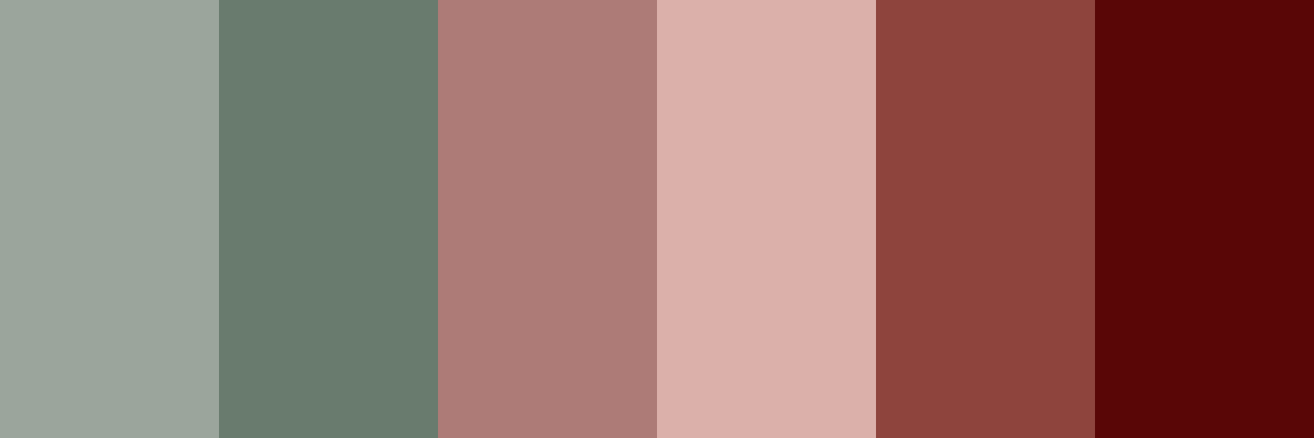 from these colors, use 6 including 2 greens to create a harmonious and warm palette < Harmonious Autumn Wedding Palette - Reordered with Dark Red Next to Burgundy> 1. Sage Green - #9BA59C - A soft, muted sage green that complements the eucalyptus, adding a tranquil and natural touch to the palette. 2. Eucalyptus - #697B6E - A deeper, muted green that reflects the natural tones of eucalyptus leaves while providing a calming and sophisticated touch. 3. Dark Green - #0A3428 - A rich, deep green that adds sophistication and depth to the palette while evoking the beauty of nature. 4. Dusty Rose - #AD7B77 - A soft, warm dusty rose that introduces a hint of romance and balances the richness of the other colors. 5. CinnaPink - #DBB0AA - A gentle blush tone that adds a light, romantic touch and balances the richer hues of the palette. 6. Terracotta - #8E443D - A warm, earthy terracotta with rich, muted tones that adds depth and complements the rustic feel of the palette. 7. Burnt Terracotta - #B35642 - A warm, rich burnt terracotta that enhances the earthy tones and complements the overall warmth of the palette. 8. Burnt Sienna - #B2502D - A warm, rich burnt sienna that adds a touch of earthiness and enhances the autumnal vibe, beautifully complementing the other colors. 9. Picante - #A94B35 - A vibrant, spicy red-orange that adds a lively, warm touch next to the burnt sienna. 10. Paprika Kisses - #D2664C - A warm coral red that adds a soft, inviting touch, enriching the palette with its warmth and versatility. 11. Burgundy - #590606 - A deep, dark red that enhances elegance and warmth, providing a bold statement perfect for an autumn wedding. 12. Dark Red - #6F0600 - A very deep, rich red that adds intensity and depth, enhancing the overall warmth and boldness of the palette. 13. Deep Crimson - #640D16 - A dark, rich crimson that adds depth and a dramatic flair, enhancing the elegance and warmth of the palette. 14. Vibrant Red - #9F2800 - A striking vibrant red that adds a bold and lively element to the palette, enhancing the autumnal color scheme.