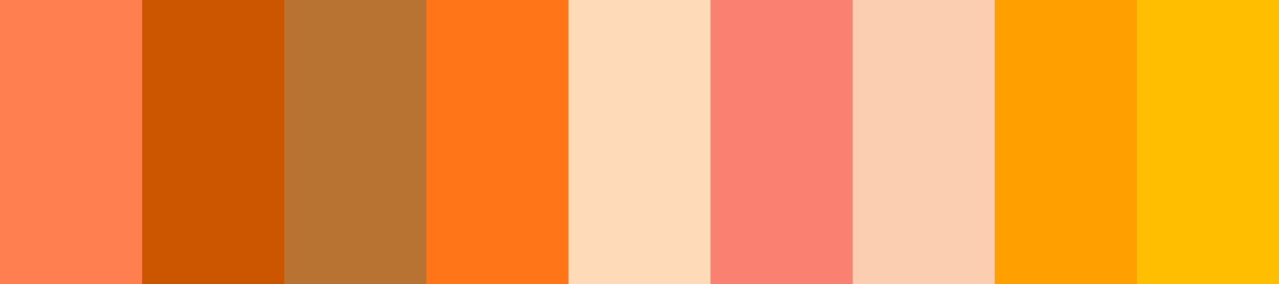 Show Me: * Coral: #Ff7 F50 * Peach: #Ffdab9 * Salmon: #Fa8072 * Apricot: #Fbceb1 * Tangerine: #Ff9 F00 * Amber: #Ffbf00 * Burnt Orange: #Cc5500 * Copper: #B87333 * Pumpkin: #Ff7518