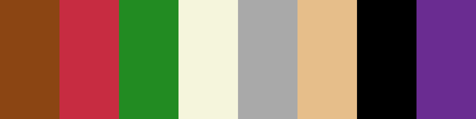 This color palette reflects the cozy and inviting atmosphere of a cabin during winter. The warm browns and reds create a sense of comfort, while the greens and golds introduce a festive touch. The addition of purples offers a unique contrast, making it suitable for a variety of designs, from holiday cards to interior decor.