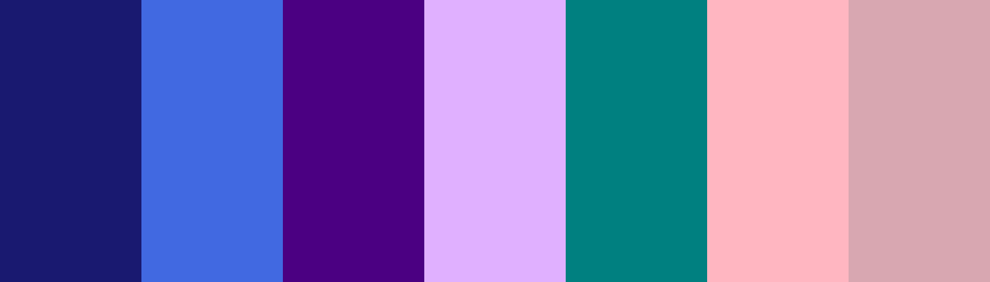 Color pallette using 7 different colors, dark blues, mauve, teal green, pinks