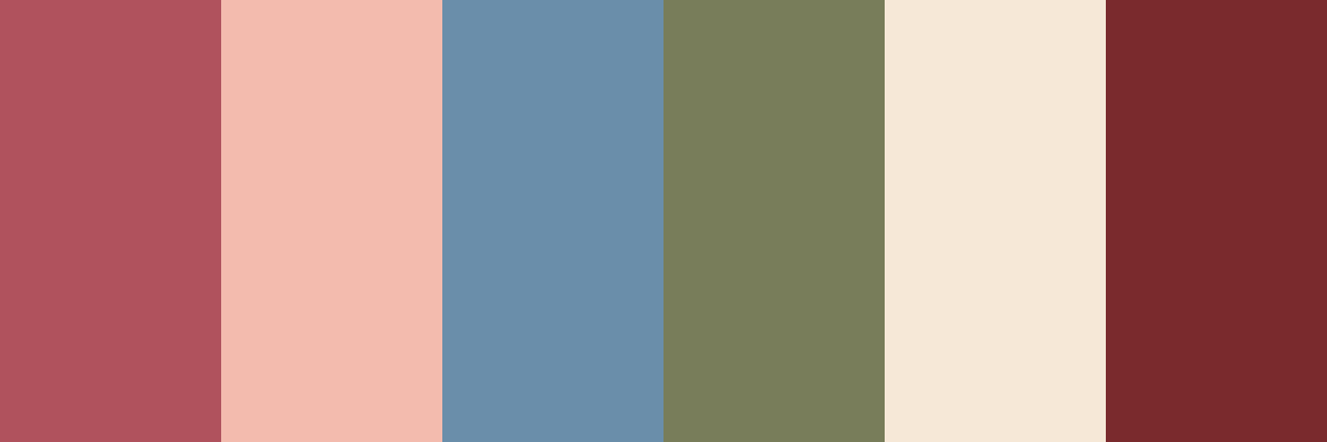This palette includes colors that create a pleasing balance with #B0525D , combining warmth with contrasting tones for visual interest. The pale peach and cream lighten the overall feel, while slate blue and olive green introduce a refreshing contrast. Burgundy adds depth and richness, making it versatile for various design applications.