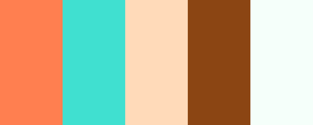This palette celebrates the warm, inviting coral color alongside a refreshing turquoise, soft peach puff, earthy saddle brown, and subtle mint cream. It’s perfect for designs that aim for a warm, inviting, and tropical feel.