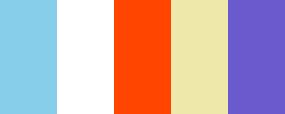 This palette features the calming sky blue, paired with crisp white for brightness, vibrant sunset orange for a pop of color, soft pale goldenrod for warmth, and a rich slate blue for depth. It conveys a refreshing and energetic feel, perfect for designs that wish to capture the essence of a clear sky.