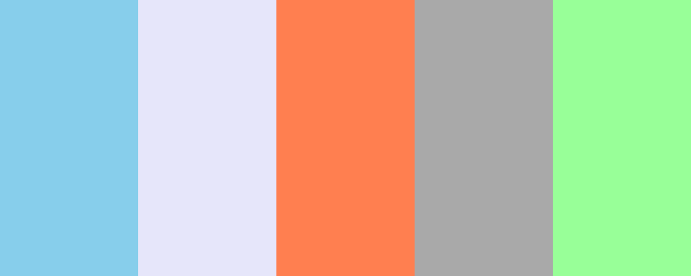 This palette celebrates the serene sky blue alongside soft lavender for a calming effect, vibrant coral for warmth, dusk gray for grounding, and mint green for a refreshing touch. It creates a balanced and tranquil atmosphere, suitable for designs aiming for peace and harmony.