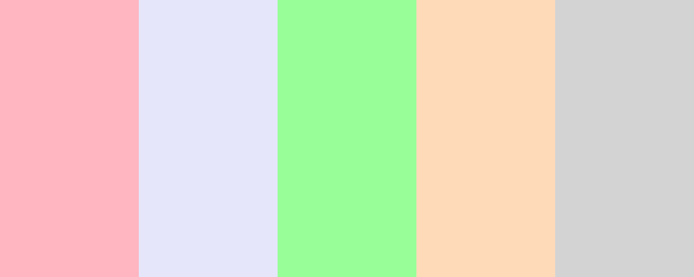 This palette emphasizes the soft and delicate light pink, paired with calming lavender, refreshing mint green, warm peach, and a neutral soft gray. It creates a gentle and inviting atmosphere, perfect for designs that aim to evoke feelings of warmth and affection.