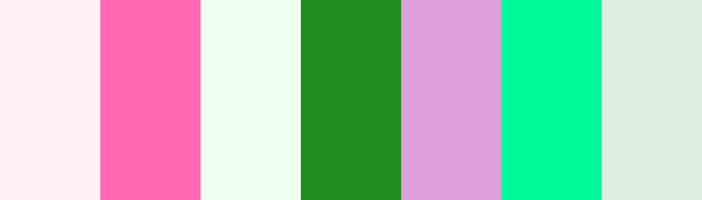 The “SSCW Fandom Wiki Light Mode” color palette features soft and vibrant tones that create a welcoming and engaging atmosphere for users. The light pink ( #FFF0F5 ) serves as a gentle article background, while the vibrant aqua ( #00FA9A ) adds an eye-catching accent. The sticky navigation bar is softened by a light green ( #E0EEE0 ), complemented by the playful link color of hot pink ( #FF69B4 ). The community section is defined by a refreshing light green ( #F0FFF0 ) for the background, with rich green text ( #228B22 ) that ensures readability, and a soft lavender ( #DDA0DD ) for the community header, adding a touch of elegance.