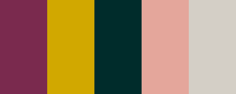 In this version of “Harmonious Warmth,” the deep blue teal provides a strong, rich contrast to the golden mustard, while maintaining a cooler tone. The muted red violet, warm coral, and soft beige-gray continue to create a cohesive and inviting atmosphere.