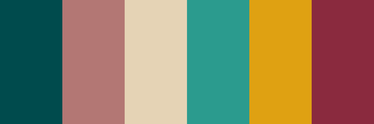 Diese Palette, genannt “Warm Embrace,” kombiniert warme und harmonische Töne, um eine einladende Atmosphäre zu schaffen. Der tieftealfarbene Farbton bietet eine solide Basis, während das gedämpfte Türkis und das goldene Gelb Wärme und Lebendigkeit hinzufügen. Der warme Burgunder und das staubige Rosa sorgen für Tiefe, während das sanfte Creme als sanfter Akzent wirkt und die gesamte Palette abrundet.