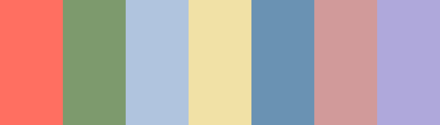 Understood! Here’s a revised color palette with 7 distinct colors that are less vibrant, with a more muted tone, especially for the blues: