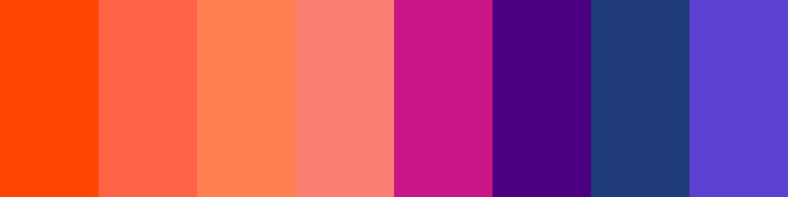 Voici une palette de couleurs allant du rouge feu au bleu gaucho rougeâtre amplificateur, offrant une transition vibrante et dynamique entre ces teintes chaudes et profondes.