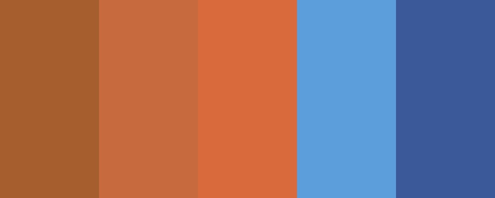 Voici une palette de couleurs inspirée du dégradé de rouille à bleuet, offrant une transition chaleureuse entre des teintes terreuses et des nuances fraîches de bleu.