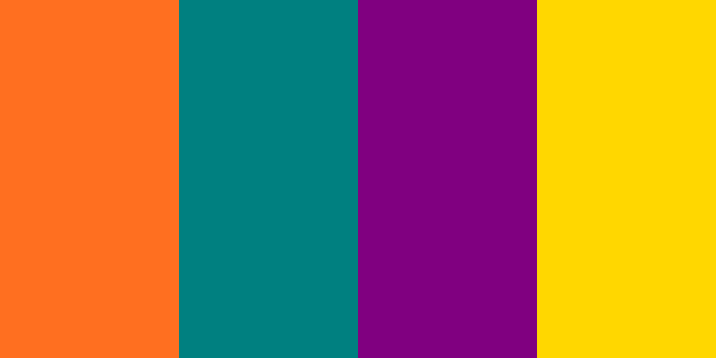 Palette Description: This palette, named “Vibrant Harmony,” features the warm and energetic Tangerine, the refreshing depth of Teal, the bold richness of Purple, and the cheerful brightness of Golden Yellow. Together, these colors create a lively and visually appealing combination that can be used in various design projects.