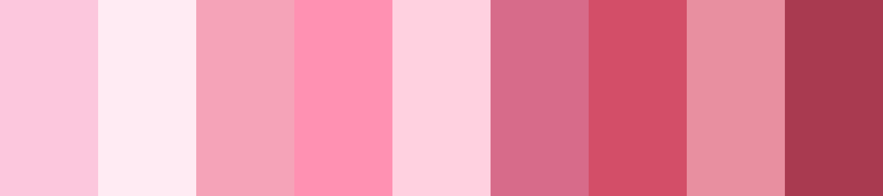 Here’s a color palette based around your specified hex codes #FCC7DD , #FF91B2 , and #D34E68 . Each base color has been paired with a highlight and a shade to create a harmonious palette.