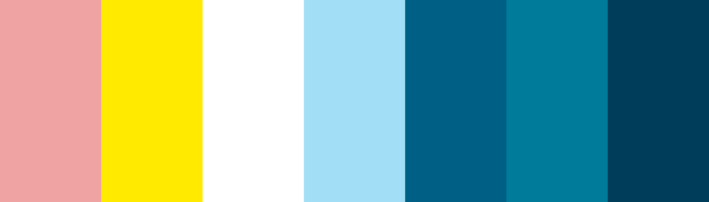 Here’s a color palette designed for a flat color design, starting with the hex code #EFA3A3 , including a yellow background, white, a cool baby blue, and darker blues that evoke the feeling of water.