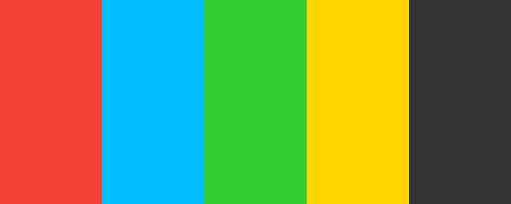This palette features a strong crimson red at its core, complemented by a bright blue, a fresh lime green, a sunny yellow, and a neutral charcoal gray. Together, these colors create a vibrant and energetic atmosphere.