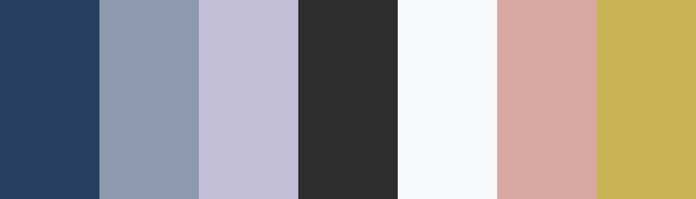 The “Muted Elegance” palette combines rich, muted tones with soft highlights to create a sophisticated and serene atmosphere. The Deep Blue serves as a strong, grounding base, while Steel Gray and Lavender Gray introduce a tranquil and calming effect. Charcoal adds depth, and Soft White provides a bright contrast. Dusty Rose adds a warm, inviting touch, and Antique Gold brings a hint of opulence, making this palette perfect for refined design projects.