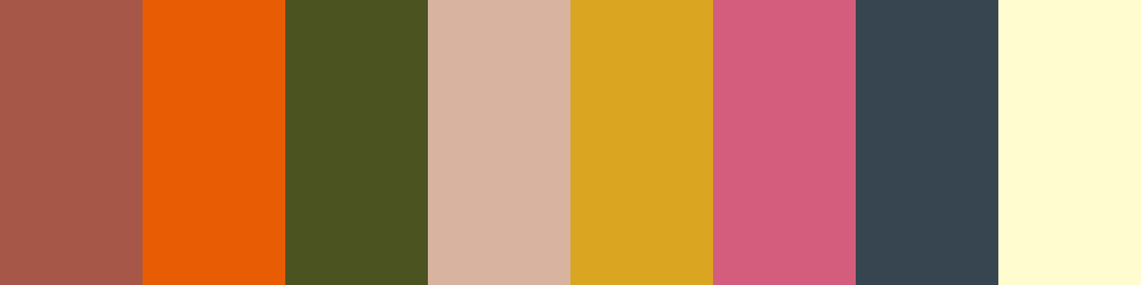 The “Warm Earth Tones” palette embraces the warmth of Rust as the main color, complemented by rich and inviting shades such as Burnt Sienna and Olive Green. The inclusion of Clay Beige and Dusty Rose adds softness, while Deep Goldenrod introduces a touch of brightness. Charcoal Gray provides a grounding element, and Cream lightens the palette, making it versatile for a variety of design applications.