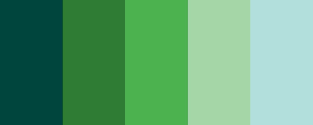 This palette, named “Deep Forest,” features a range of greens that evoke the tranquility and depth of a forest setting, starting from a rich dark teal and moving towards softer mint tones.