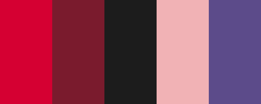 The “Baiken’s Hair Colors” palette highlights the striking shades of red and dark tones that characterize Baiken’s hair. Vibrant crimson represents her boldness, while dark cherry adds depth. Ashy black provides a grounding effect, and soft rose introduces a delicate contrast. Faded plum adds a subtle hint of complexity to the overall look.