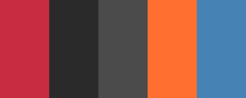 This palette features Crimson Red for intensity, Jet Black for depth, Charcoal Gray for a strong foundation, Dark Orange for fiery energy, and Steel Blue to balance the palette with a touch of calm strength.