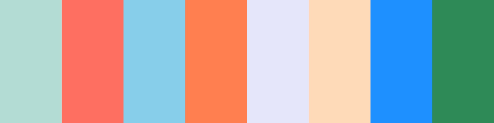 Palette Description: The “Ocean Breeze” palette draws inspiration from the serene colors of the ocean and coastal landscapes. The soft mint serves as the base, complemented by vibrant coral and sunset hues, along with calming blues and greens that evoke a relaxing seaside atmosphere.