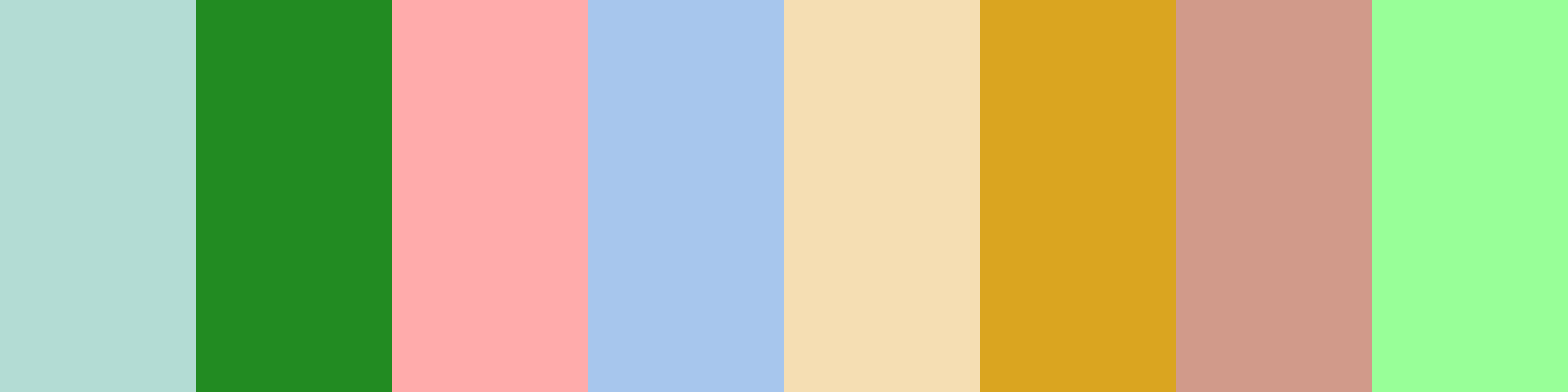 This palette blends the soothing aqua with a deep forest green, complemented by warm and soft pastel tones, creating a serene and inviting atmosphere.