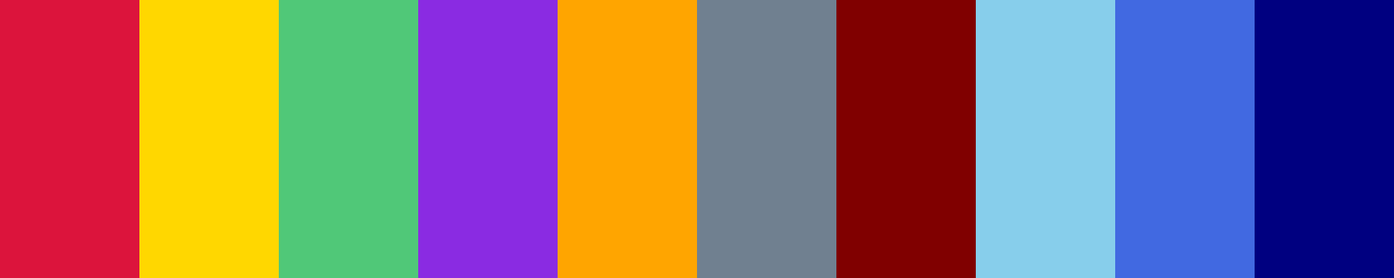 This palette features a variety of vibrant and distinctive colors. The first seven colors are chosen to provide a broad spectrum, while the last three are different shades of blue to meet your requirement.