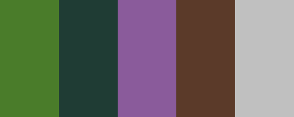 This palette evokes the serene and magical ambiance of an enchanted forest, featuring rich greens, earthy browns, and hints of mystical purples and silvers.