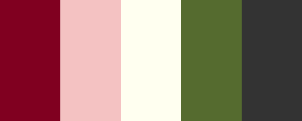 This palette highlights burgundy, a deep and luxurious color, paired with soft blush pink and ivory for a touch of elegance. Dark olive green adds an earthy contrast, while charcoal provides a grounding element, making this palette versatile for both sophisticated and contemporary designs.