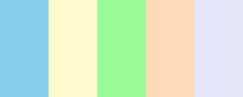This palette combines soft, uplifting colors that evoke a sense of lightness and positivity. The sky blue and soft yellow represent openness and warmth, while the mint green, peach, and lavender add a fresh, calm touch.