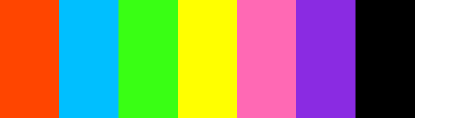 The “Neon Vibes” palette features vibrant and striking colors that encapsulate a lively, energetic theme. The colors range from the fiery Inferno Orange to the cool Electric Blue, complemented by fresh Lime Green and classic Bright Yellow. The addition of Neon Pink and Blue Violet introduces a playful twist, while Black and White serve as grounding elements.