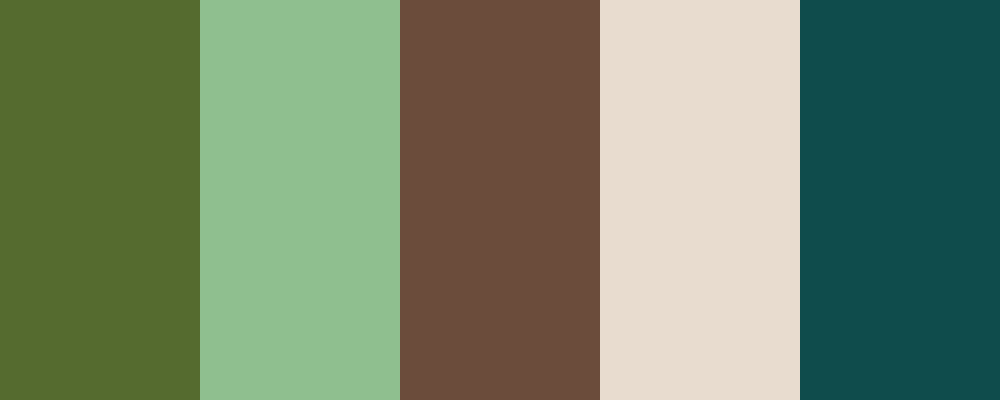 The “Forest Serenity” palette embodies the tranquil essence of a lush forest. It combines the earthy tones of moss green and warm bark brown with the softness of fern and mushroom beige, while the deep teal accent adds a touch of sophistication and depth.